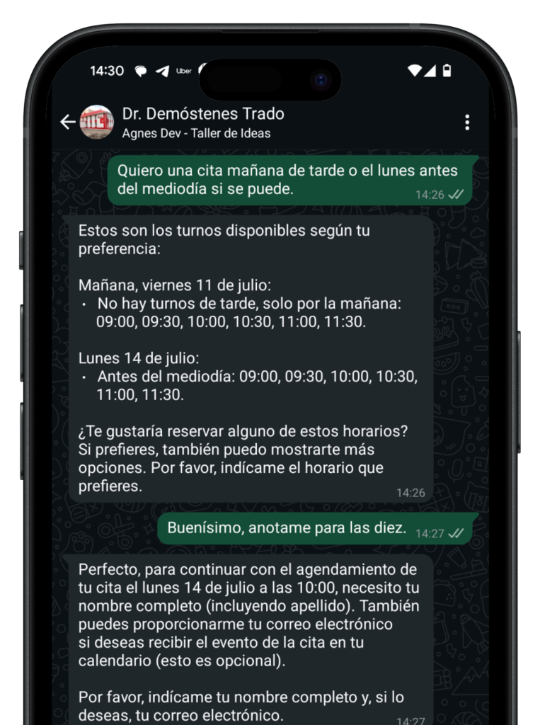 Tus clientes piden, cambian o cancelan turnos todo el día. Agnes los atiende 24/7, agendando directo en tu calendario y enviando recordatorios.